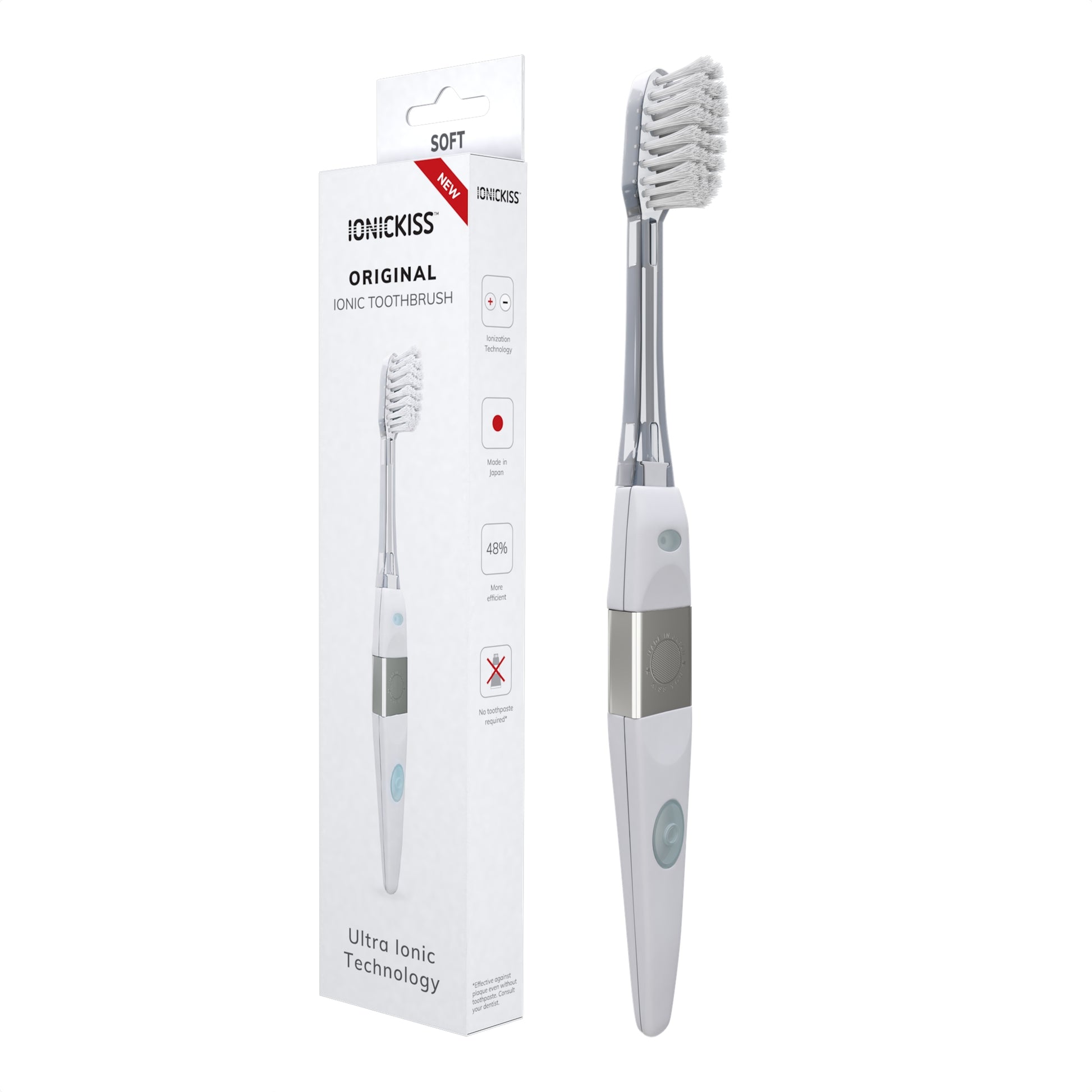 Cepillo dental ionizante Ionickiss Original con cabezal reemplazable a tu elección. El cepillo de dientes manual más avanzado de la historia, clínicamente probado para eliminar un 48% más de placa que los cepillos de dientes normales.